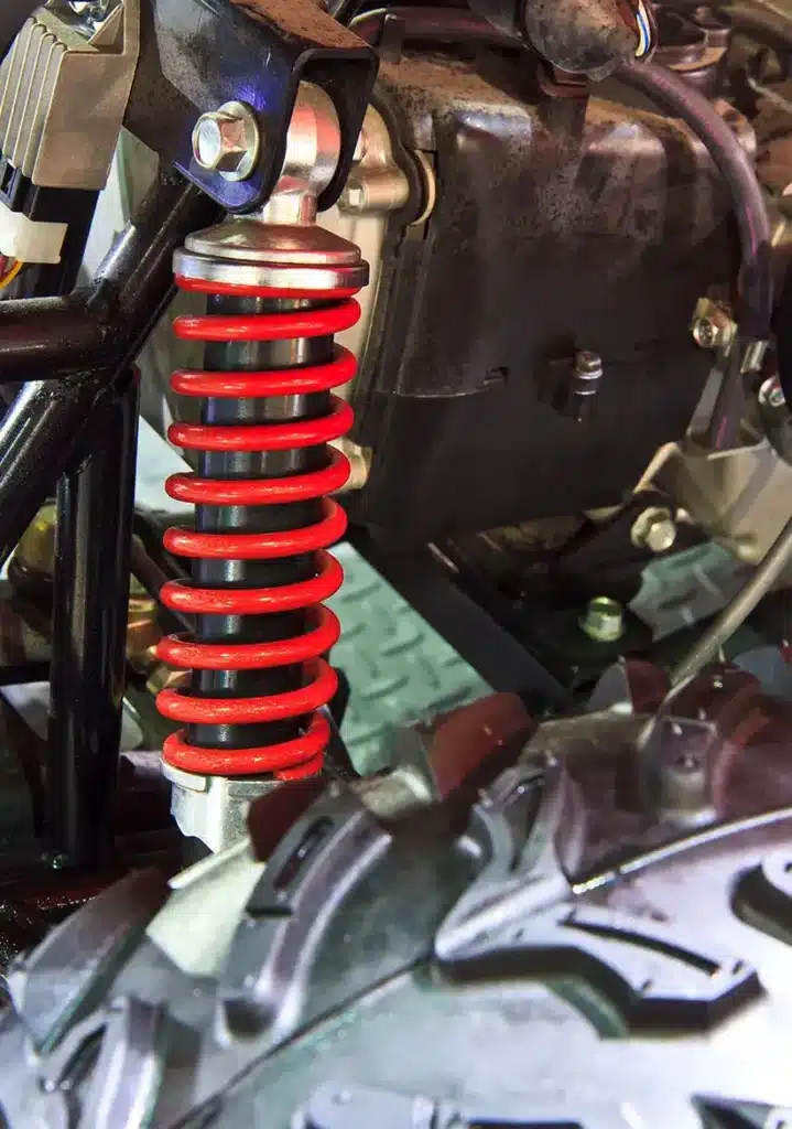 Shocks & Struts Replacement in Clive, IA At Westside Auto Pros. Close-up of a red coil spring suspension system on an off-road vehicle, with a large rugged tire and metal components visible in the background.